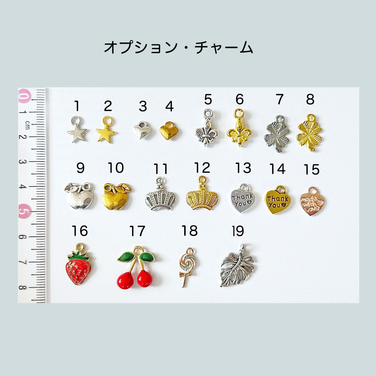 ②チャームをつけることができます。(有料)プルダウンメニューから種類を選び、色が複数ある場合はご希望の色を備考欄にご記入ください。